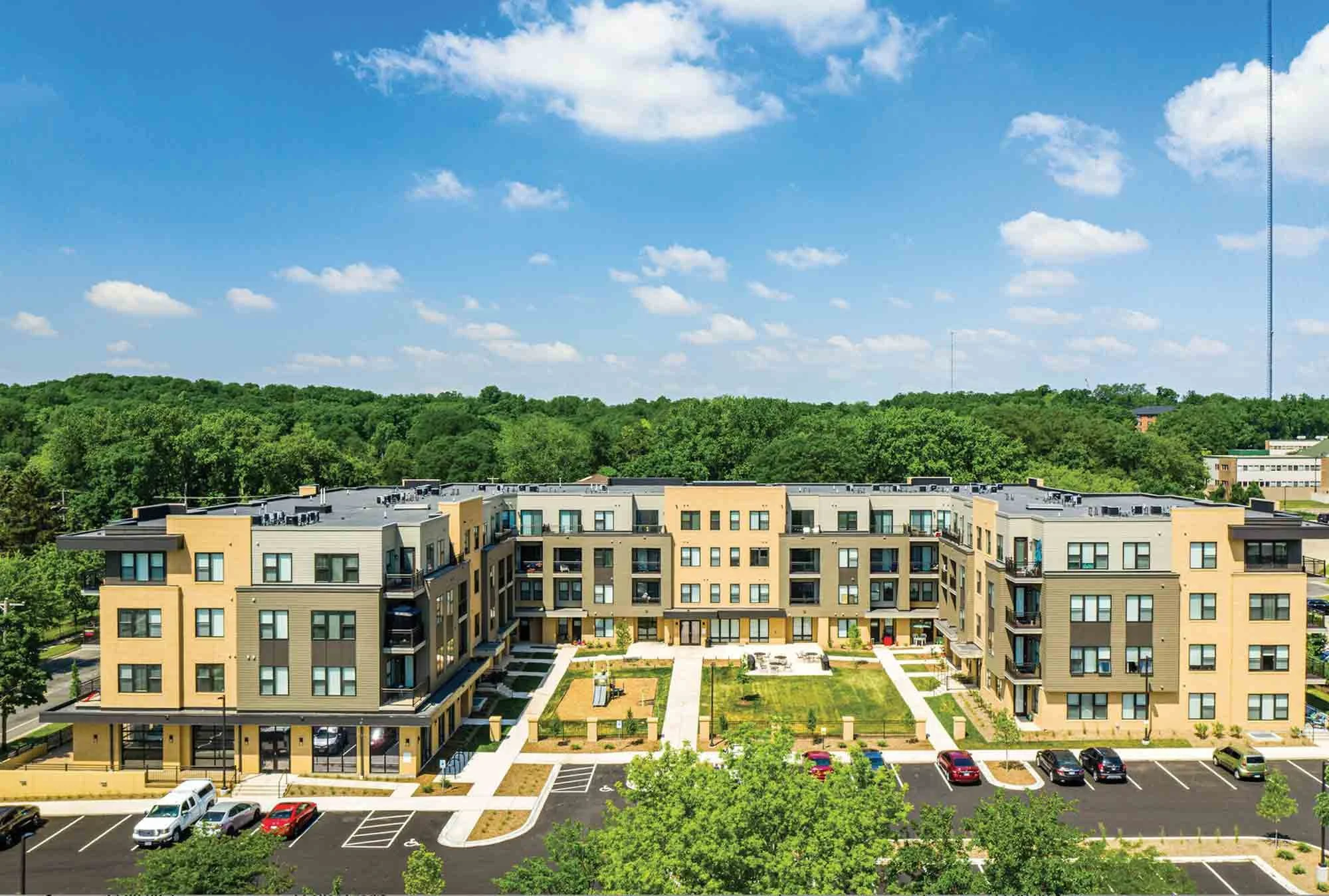 An aerial view from the parking lot side of the brick, mixed use Tailor Place building at 5630 Schroeder Road, Madison, WI 53711. Building is warm natural tones with street level retail/office space and three stories of multifamily housing above.